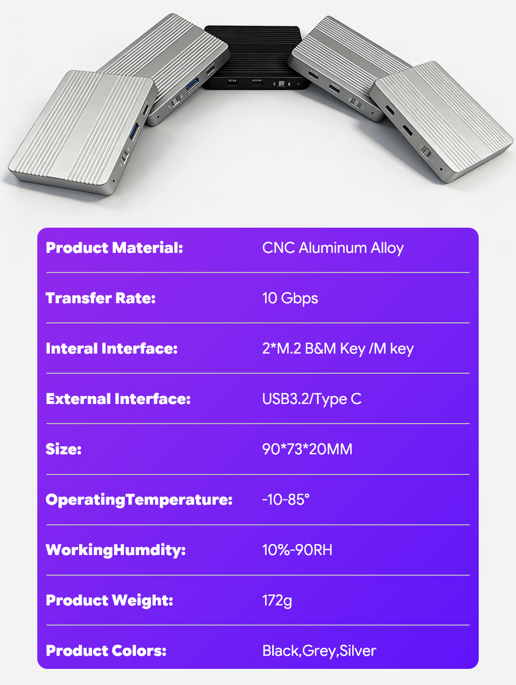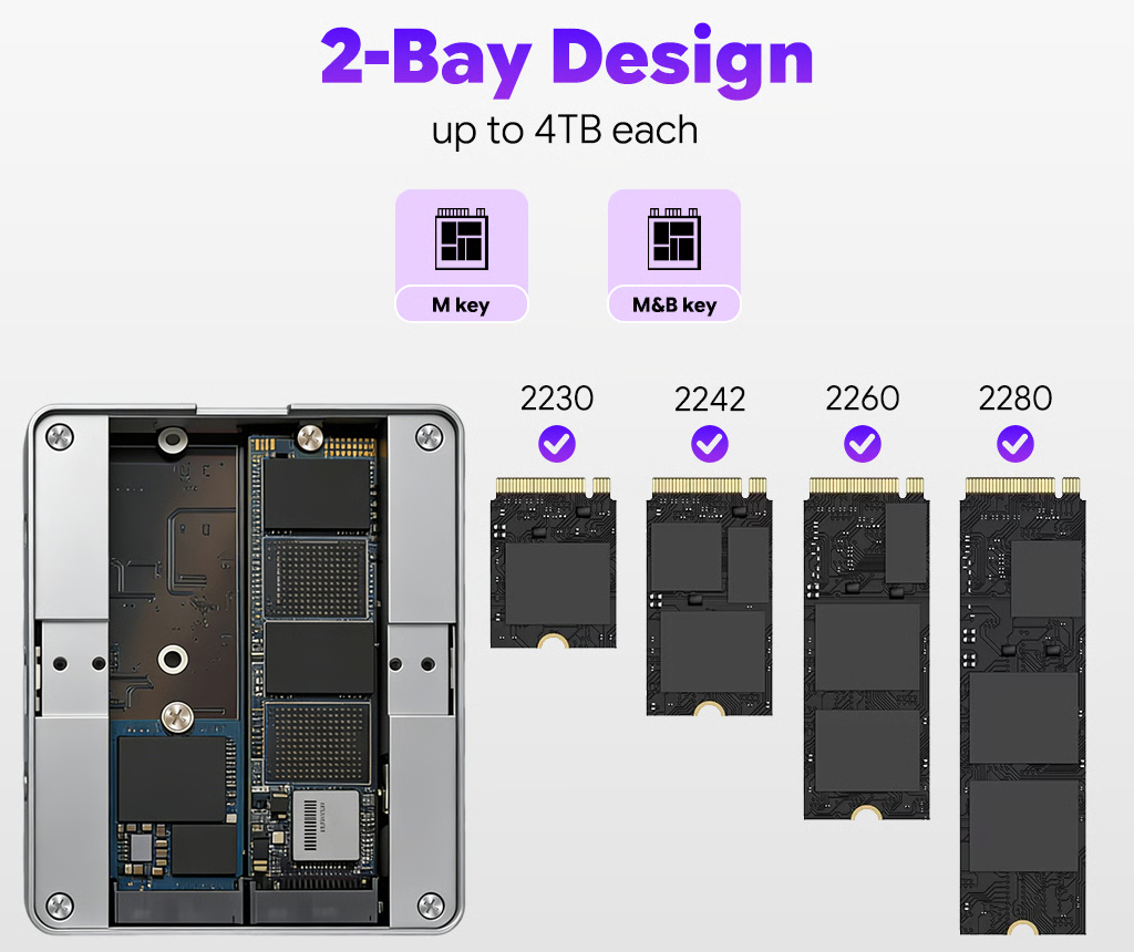 The X1 dual-bay NVMe SSD enclosure is compatible with a full range of M.2 NVMe SSDs. Unlike traditional single-bay enclosures that limit you to one drive type, this powerhouse lets you slot two NVMe SSDs. You can mix different sizes or brands flexibly, using one drive for 4K video footage and the other for design project backups, no extra enclosures or tangled cables needed.