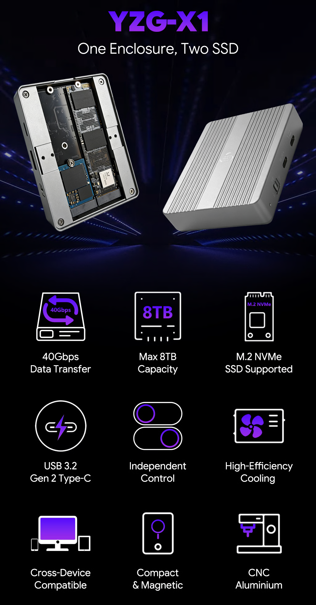 The X1 dual-bay SSD enclosure is the ultimate solution to the common problems every creator encounters. Boasting Thunderbolt 3/4 40Gbps speed, 8TB max capacity, independent drive control, and silent active cooling, it supports mobile on-shot storage and cross-device plug-and-play. It delivers pro-grade performance for creators and geeks alike.