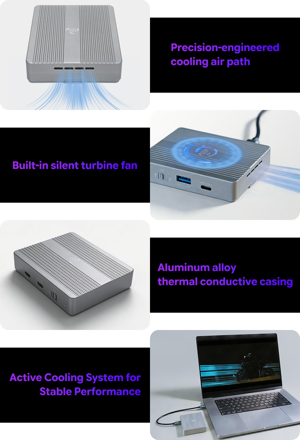 Built with an aviation-grade aluminum alloy shell for rapid heat conduction, it pairs with a silent turbo fan and thermal silicone pads to form a 360° heat dissipation loop. The fan runs at variable speeds based on real-time temperature, keeping your SSDs cool during high-speed transfers or prolonged use. Unlike passive cooling solutions that cause speed drops and shorten drive lifespan, this system maintains consistent 40Gbps transfer speeds and stable performance, even when handling large 4K video files or running dual drives simultaneously. Quiet, efficient, and reliable.