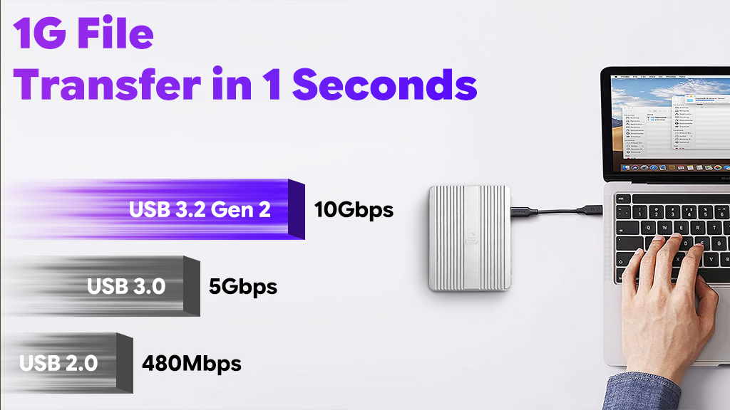 Say goodbye to lag! Blaze through massive file transfers in seconds with the X1's USB 3.2 Gen 2 port, which supports up to 10 Gbps. Boosted by the accelerated transmission protocol, X1 unlocks your SSD's full potential for non-stop, peak performance.