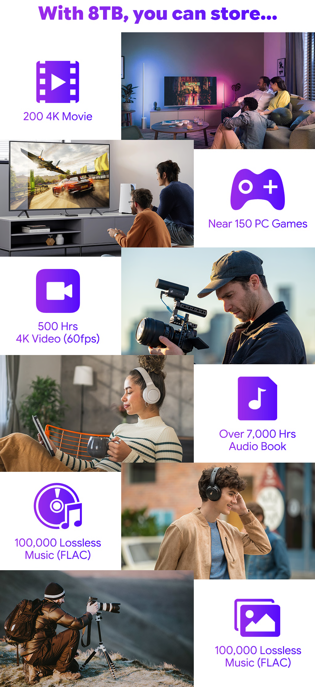 X1 delivers a massive storage space of up to 8TB, eliminating any concerns about running out of storage space. This allows you to effortlessly store large amounts of 4K raw footage, high-resolution photos, lossless music libraries, and bulky design files without worrying about capacity limitations. Whether you need high-capacity storage for professional creative work or enjoy hoarding high-quality media during leisure time, the X1's 8TB capacity has got you covered.